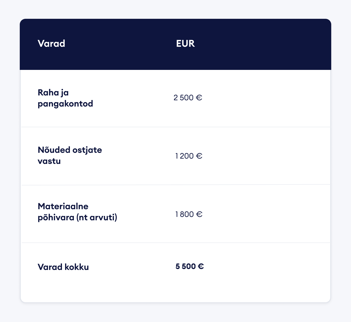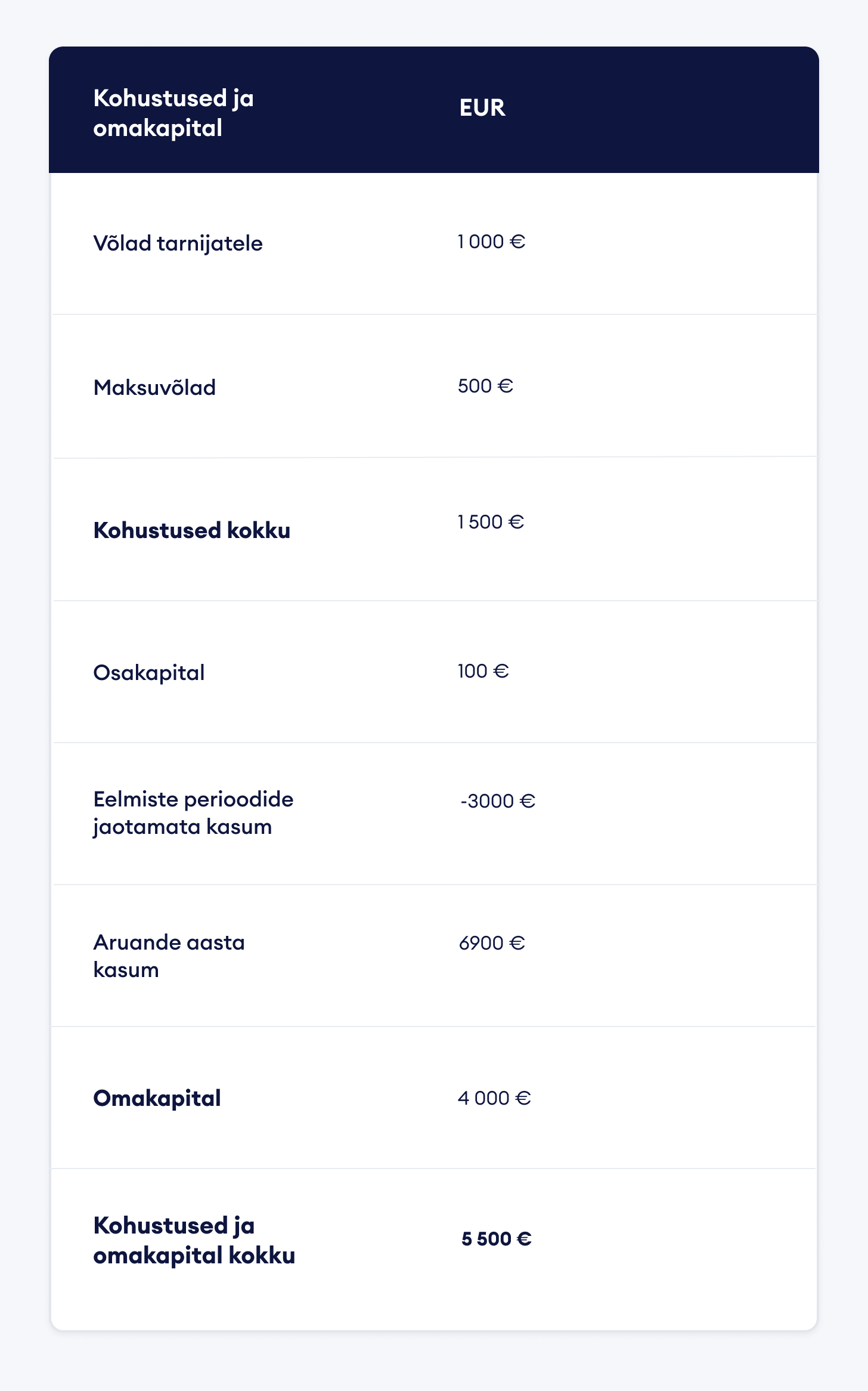 🔎 Selgitus: Bilanss peab alati tasakaalus olema: varad = kohustused + omakapital. Kui kohustused ületavad varasid, on ettevõttel negatiivne omakapital ja tegevusaruanne muutub kohustuslikuks.